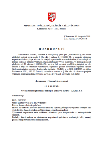 S radostí oznamujeme, že dne 30. 11. 2018 byla Ambis. Vysoká škola zapsána na prestižní seznam výzkumných organizací v ČR.