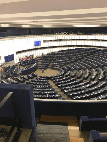 Po náročném jídle a prohlídce města jsme se všichni přesunuli před budovu Evropského parlamentu, před vstupem jsme se museli podrobit vstupní prohlídce a následně jsme se dočkali prohlídky celé budovy s originální a moderní architekturou. Čekala tam na nás přednáška s prezentací o historii, zajímavostech i vyhlídkách do budoucnosti EU, do které se studenti s velkým nadšením zapojovali. Na přednášce jsme si zopakovali, jak základní informace, ale také i všechny zákoutí evropského parlamentu. Historie parlamentního shromáždění sáhá až do roku 1951, kde se o ni poprvé dozvídáme v rámci Pařížské smlouvy, která sloužila k exportu a importu uhlí a oceli. Mezi další zajímavosti patří například, že v roce 1976 došlo ke změně smluv o od roku 1979 byli poslanci volení přímou volbou občanů jednotlivých členských zemí.