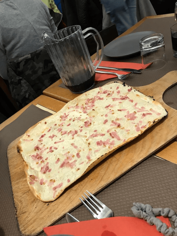 Po prohlídce města, následoval pozdější oběd v tradiční alsaské restauraci. Zdejší obyvatelé byli velice milí a přátelští, proto to byl velice příjemně strávený čas s neomezeným jídlem a pitím. Jako hlavní chod byl Flammekueche tartiflette - tradiční francouzské jídlo s cibulí, špekem a smetanou, ale také i koláč se skořicí, čokoládou a ovocem. Ke spláchnutí tohoto výborného pokrmu na všechny čekaly bezedné láhve vín.