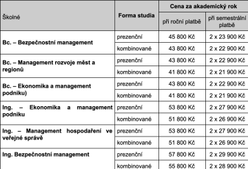 | Bc. – Bezpečnostní management | kombinované | 43 800 Kč |