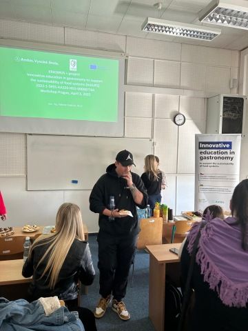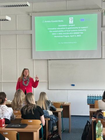 3. 4. 20205 se studenti AMBIS vysoké školy zúčastnili prezentace výsledků projektu Erasmus+ Innovative education in gastronomy to support the sustainability of food systems (InGUPS) 2022-1-SK01-KA220-HED-000087766, který je spolufinancován EU. Lokální koordinátorka projektu, doc. Kiráľová, studentům prezentovala bilingvální studijní materiály z oblasti gastronomie, technologií a kulinářských technik, enogastronomie, vlivu gastronomie na rozvoj venkova a marketingu lokálních potravin. Studenti měli možnost v rámci přestávky ochutnat výstupy některých kulinářských technik.